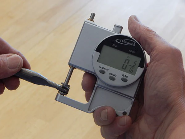 This is one handy gadget. The spring-loaded arms allow you to quickly and accurately gauge material thickness up to 27mm (1-1/16in). The compact size (the body is less than 2in across) neatly fits in an apron pocket so it's always at hand, and it's faster to operate that a set of calipers. Spring-loaded arms connect to a metal chassis with a plastic upper housing. Measures in decimal inch to 0.001in, fractions to 1/64in, and millimeters to 0.02mm.