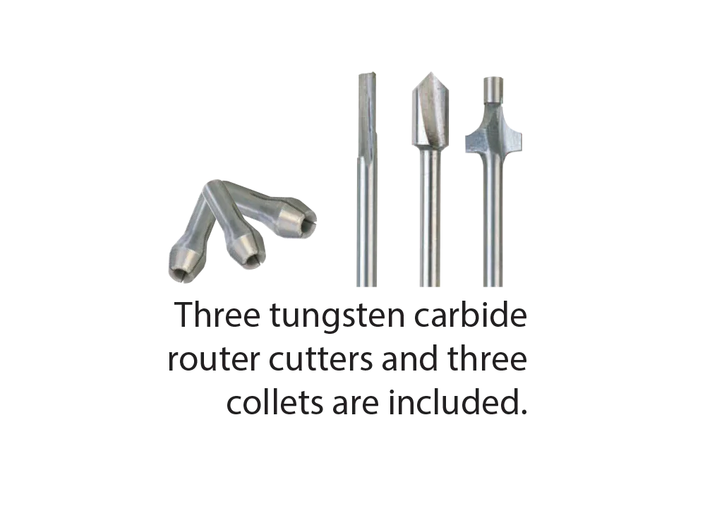 Triple slit precision collets hold the bits securely and without runout. Collets with 2.4, 3 and 3.2mm capacity are included. These can accept a wide range of cutters, making the Micro Shaper a very versatile benchtop machine. Trim and groove with spiral bits; make chamfers, bevels and roundovers with guided shaping bits; create mitres and other joints… the possibilities go on and on!